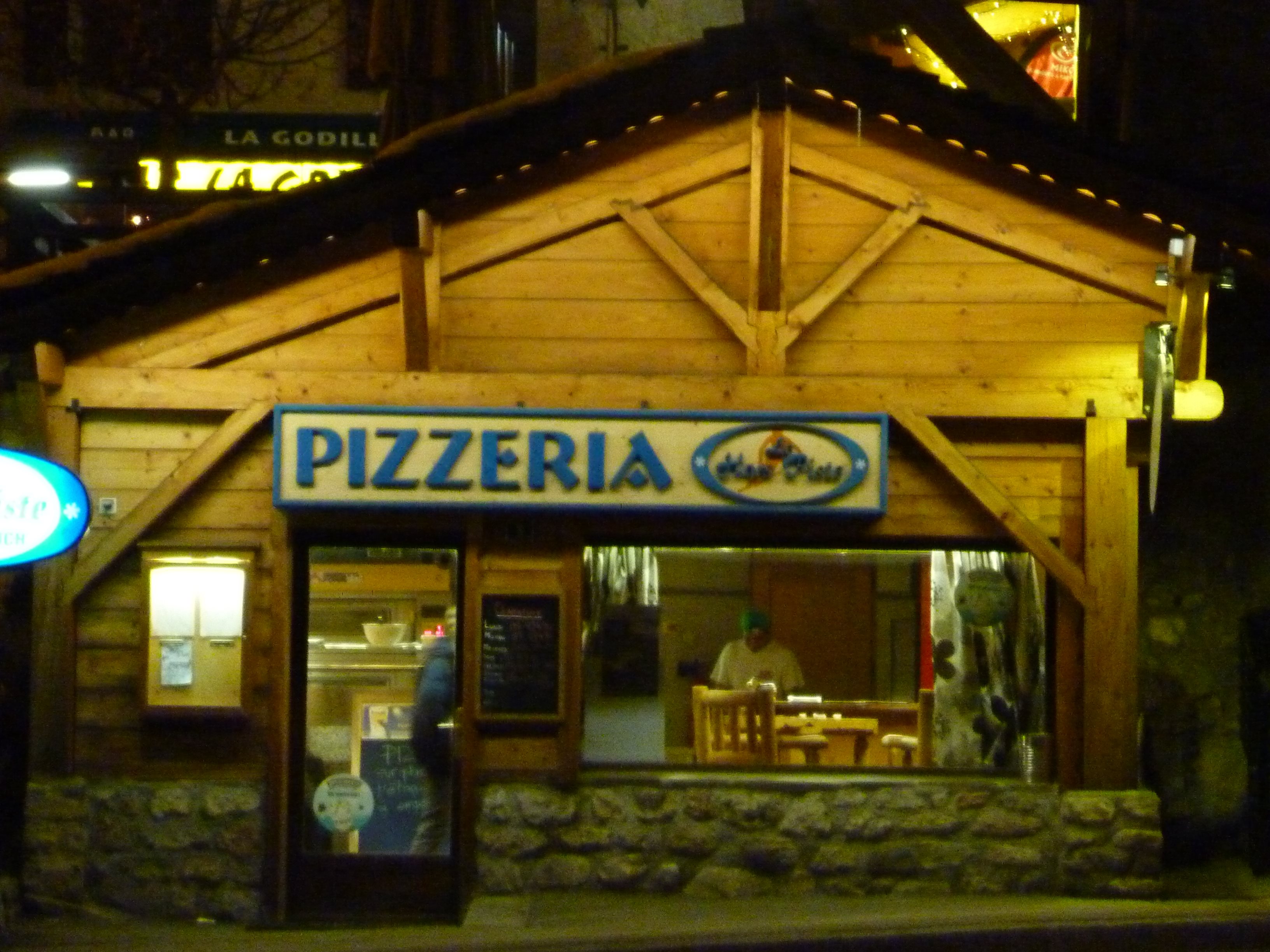 The take away part of the Hors Piste restaurant is located at the bottom of the steps just under the restaurant itself. They cook lovely freshly prepared take away pizzas. We keep a menu in the information folder in the apartment.